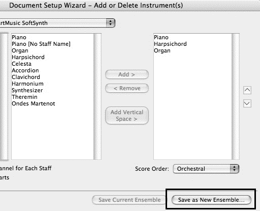 3. After you create or edit an ensemble, on the second page of the Set-up Wizard, “Add or Delete Instruments,” there is a button at the bottom of the window: “Save As New Ensemble.” Be careful to name it with a memorable name.