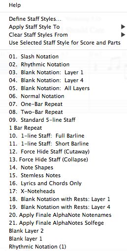 After loading the default font library into the document you have opened, you will now see the options in contextual menus that you are accustomed to. For example, here is the listing of Staff Styles in a file before and after the library was loaded: