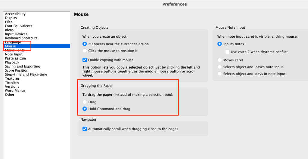 In the Mouse area of the preferences, there’s an option to change the default setting from “Drag” to “Hold Command and Drag.” If you make this change, Sibelius will now behave more like Finale. When you click and drag, you’ll be able to select elements in order to drag the manuscript paper. Remember to hold Command (or Control on Windows) while dragging.