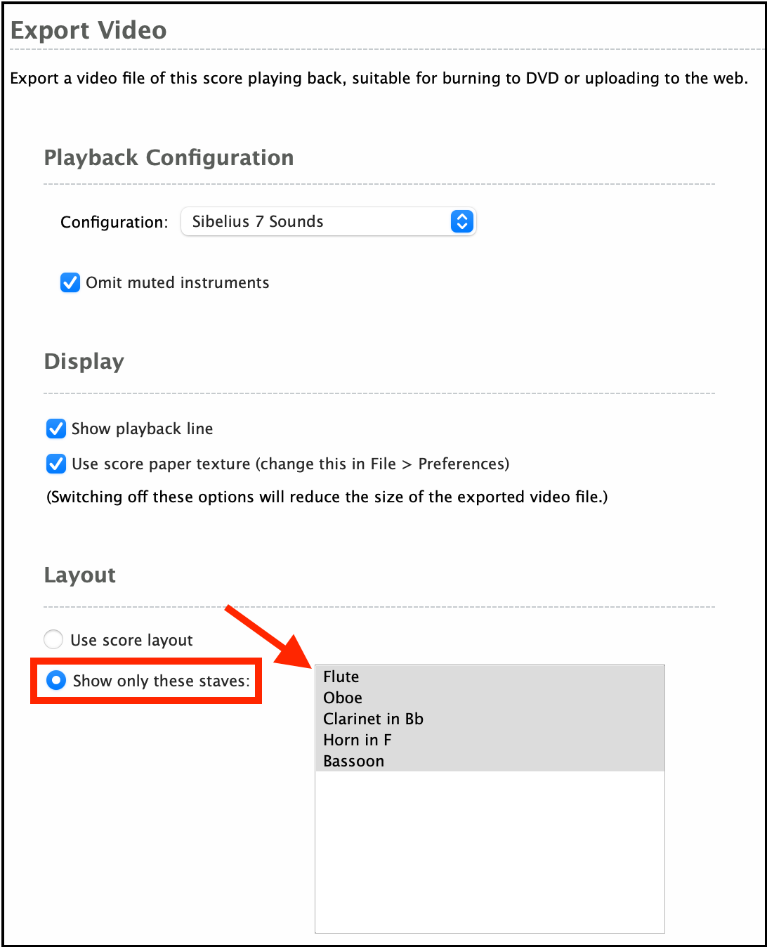 Begin by formatting your score to your liking. Once it’s ready, go to File > Export > Video in Sibelius.